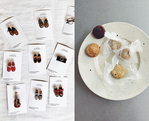 その他、hacuの靴下のイメージにあわせてセレクトしたmoa mamanさんの大人服やmorceauさんの日々の暮らしにそっと寄り添う器、Seul.さんの糸やビーズを使ったアクセサリー、marikopterさんの可愛いモチーフのブローチ、粉灯さんのお菓子なども販売します。