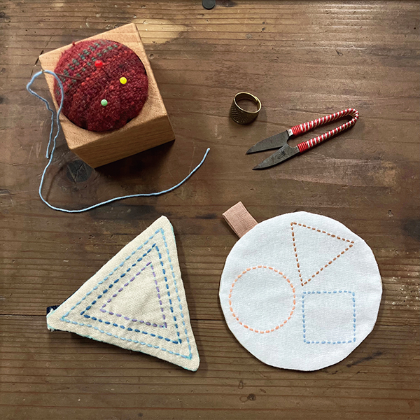 草木染めの色糸を使い、○△□の形をモチーフにしてコースターに刺し子をしていきます。
